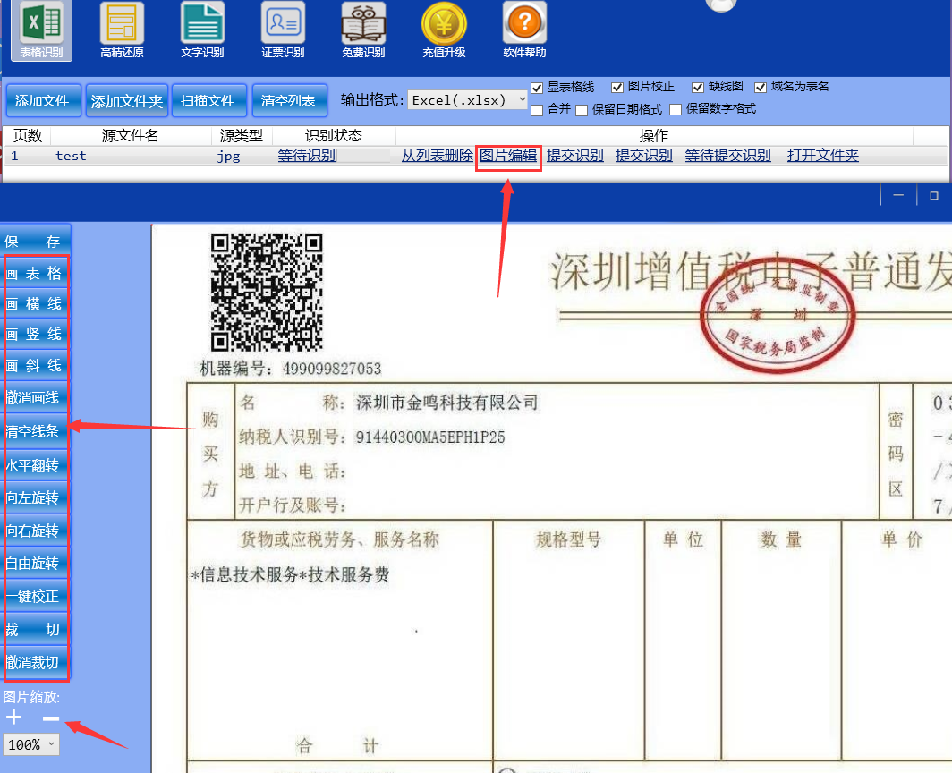 要点:图片编辑器的使用目的是通过添加缺少的表格线来获得更好的表格分隔效果,其次是通过旋转功能将图片文字方向转正,转正后要记得取消“图片校正“勾选,以防识别程序再次判断图片方向出错造成识别结果乱码,如果首次识别为乱码,或识别出的文字与图片文字大多数不相关,一般是图片方向判断出错所致,更需要先行执行此操作了;另外,最好裁切掉无需识别或次要的内容,以减少图片杂色对识别程序的干扰,提高识别率和识别效果,这在首次识别不理想的情况下采用这个方法是非常必要的。