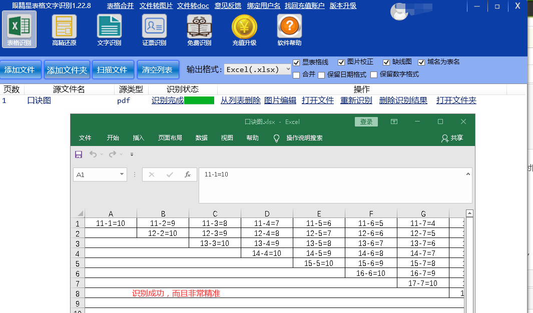 四、识别完成后点击“打开文件”即可打开当前页的pdf识别结果文件(excel文件)。