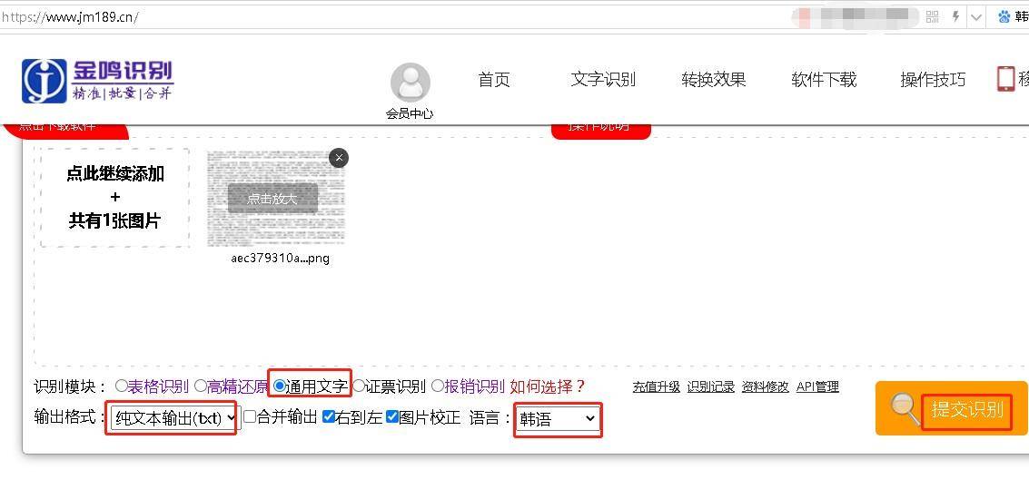 三、识别模块点选“通用文字”,输出格式选择“纯文本输出(txt)”,语言选择“韩语”。