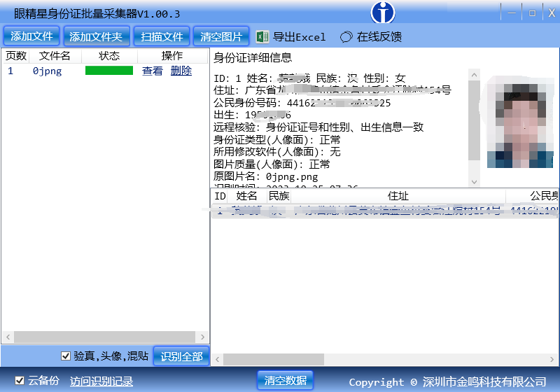 此外,需要提醒的是,身份证是一个重要的个人身份证明文件。如果身份证上的信息识别不出来或无法验证,可能会造成诸多不良后果,如无法办理相关业务、丢失个人权益、犯罪嫌疑等。因此,如果眼精星身份证批量采集器识别的结果不显示身份证号码,您就要谨慎对待了,因为这种情况的出现大概率就可判定您的这张身份证是假的,为防止产生不良后果,建议您审核清楚,确实不行就要到相关部门更换了。